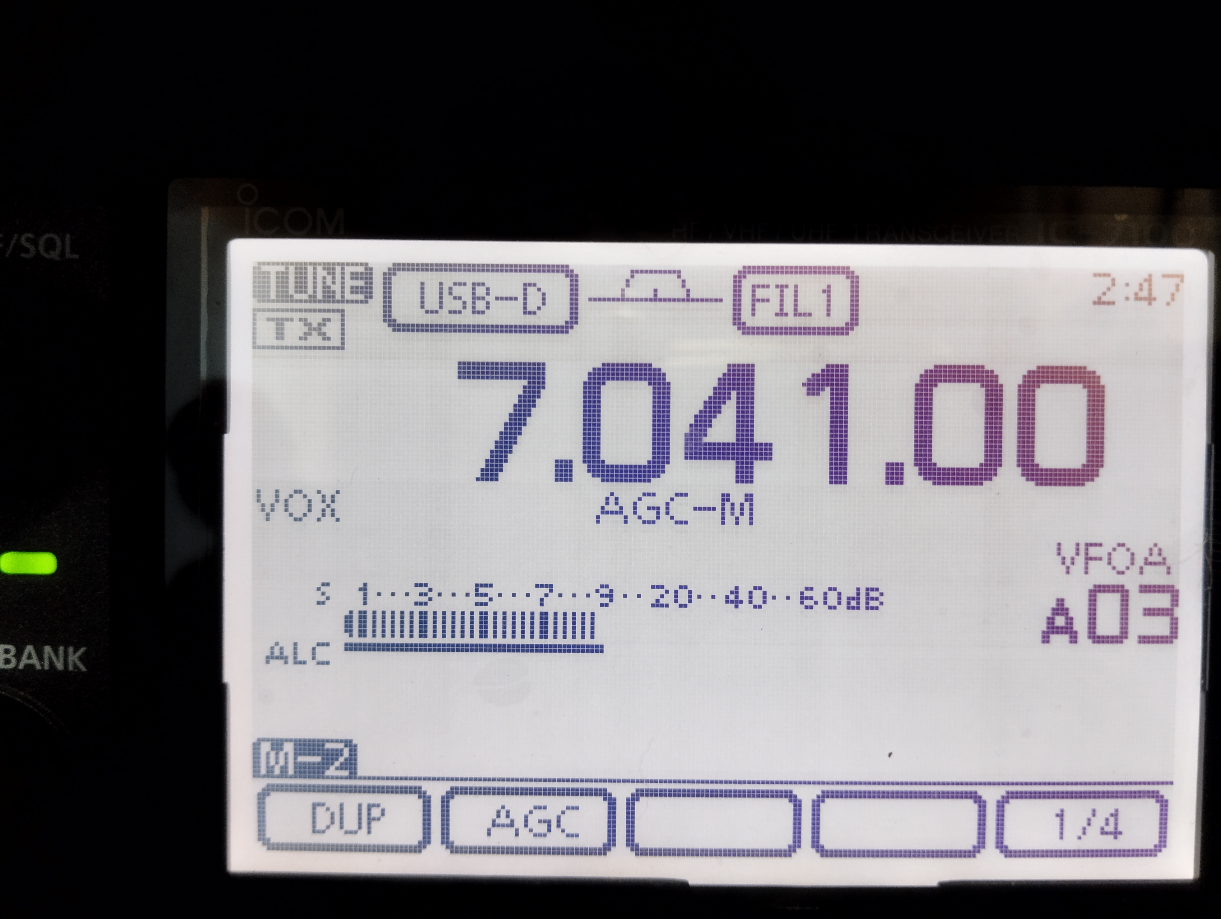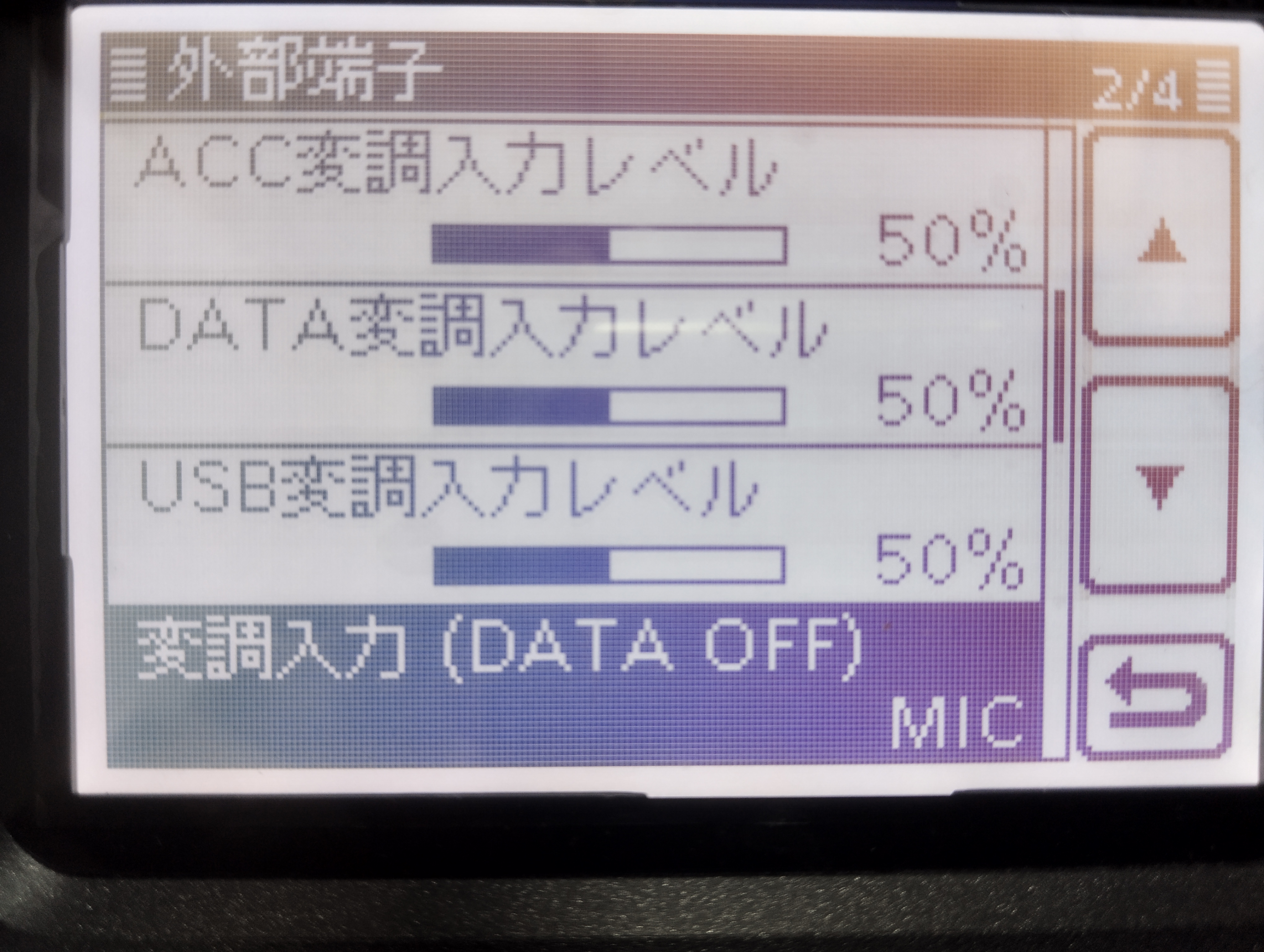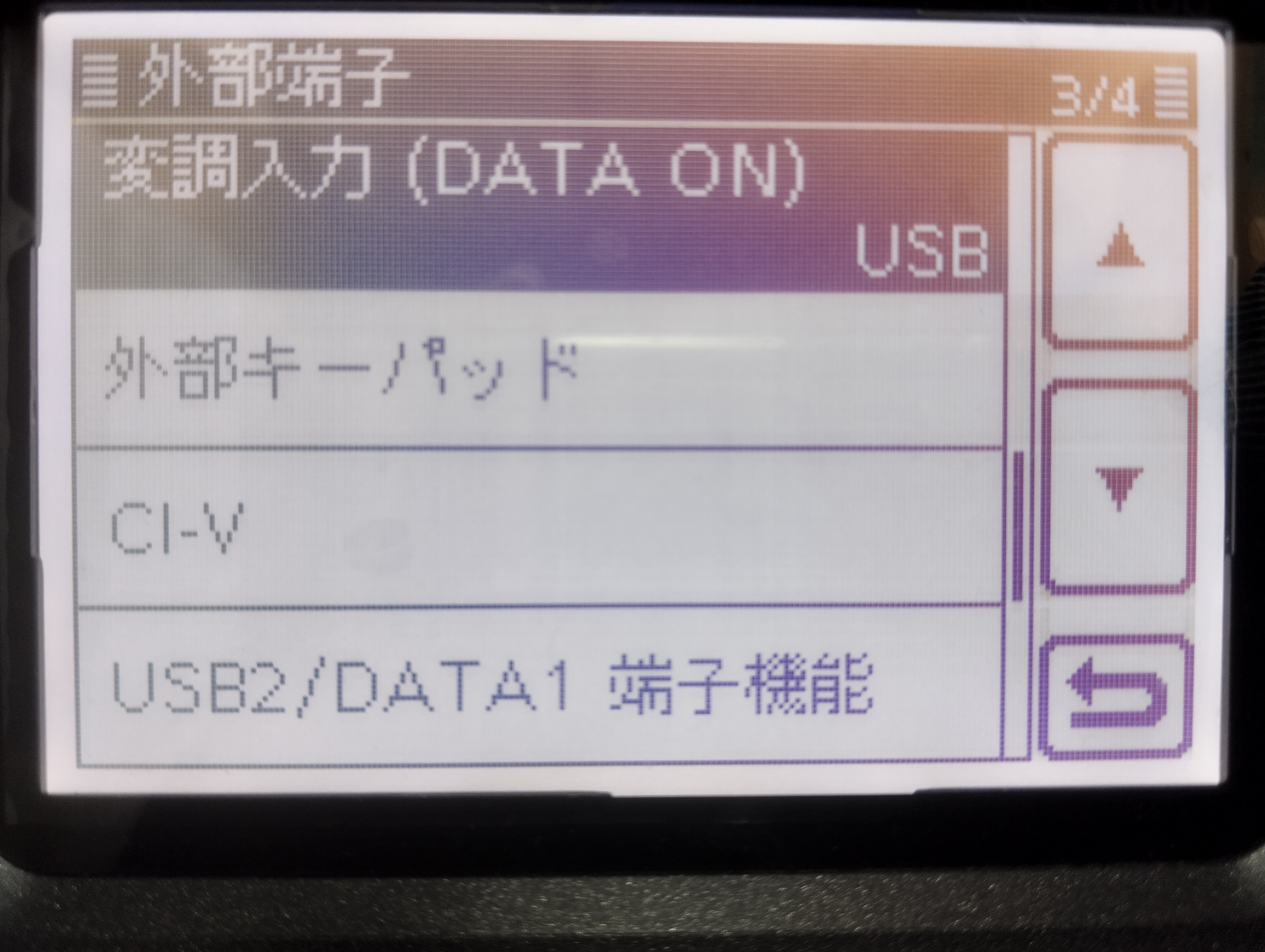 ・電波型式をUSB-Dに設定する パネル上の現在のモードがLSBなら、LSBをタッチ→SSBをタッチ→USBをタッチ→DATAをタッチ→USB-Dにする (昨年はUSBのままで行っていたが特に問題は無かったがUSB-Dを推奨しているのでUSB-Dにする)外部端子