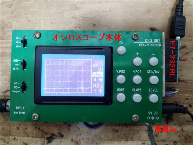 オシロスコープ、波形発生器は以前と同じものを使用しています。(FT232RLはオシロ本体に取付)
